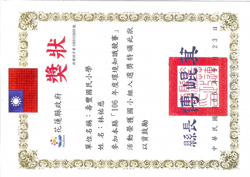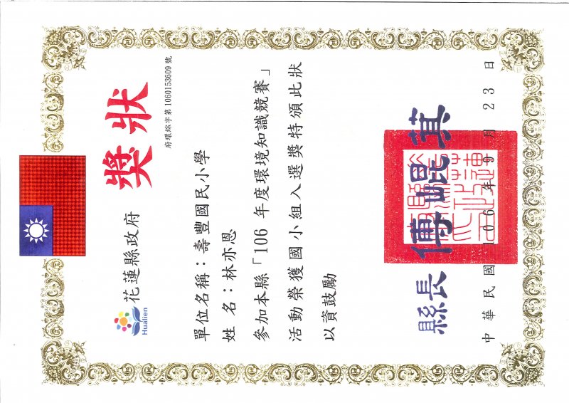 106學年度學校教師或學生榮獲中央政府或花蓮縣環境教育相關表揚獎項