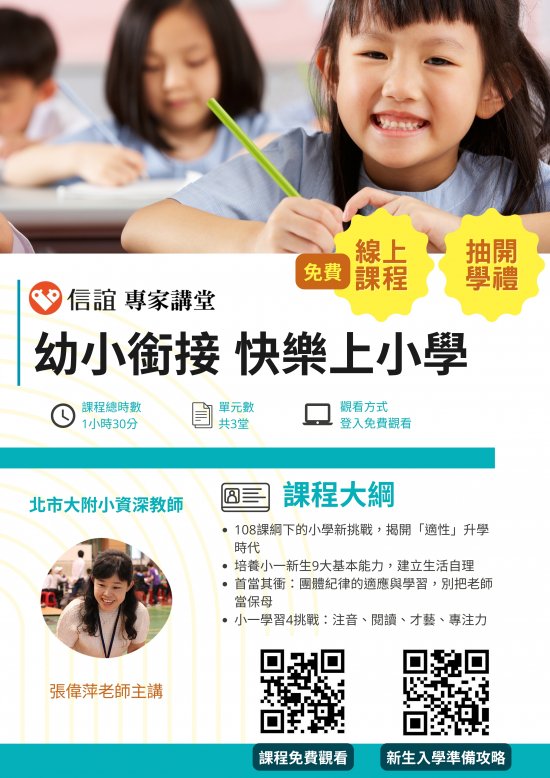 一、 | 為幫助今年即將升小一的孩子順利銜接小學生活,信誼基金會提供線上課程「做好幼小銜接 快樂上小學」讓新生家長免費觀看,由北市大附小資深教師張偉萍主講,透過3堂課程帶爸媽認識小學世界,陪伴孩子上小學。三堂課主題如下: |