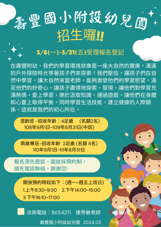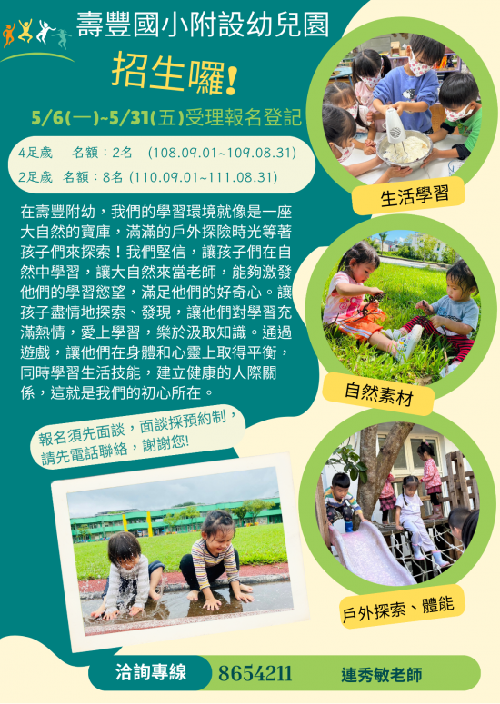 幼兒園5/6(一)~5/31(五)受理新生報名