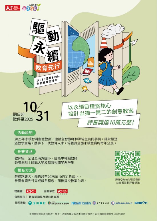 有關財團法人天下雜誌教育基金會與天下雜誌辦理之2025「永續台灣創意教案」徵選活動,鼓勵教師踴躍參加,請查照。