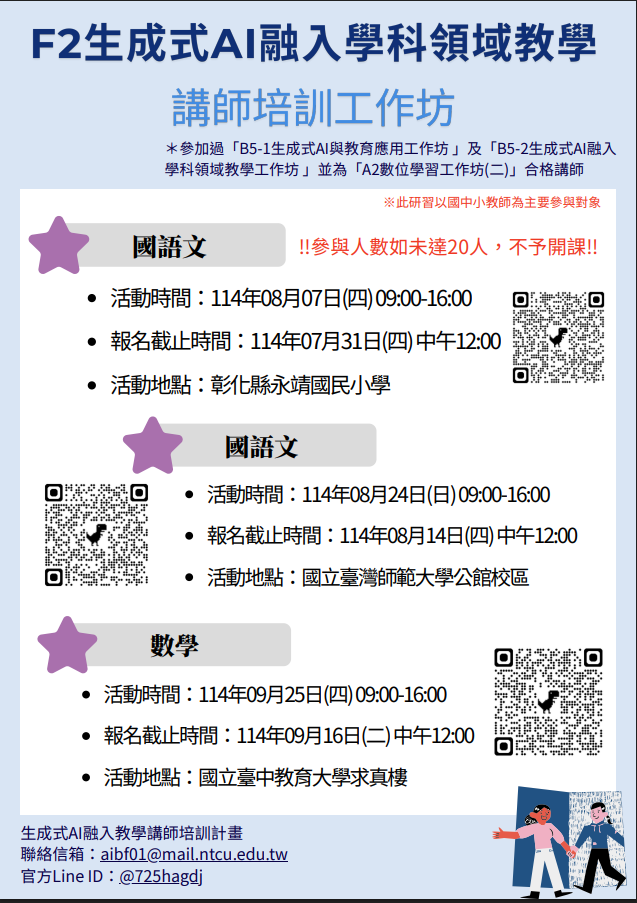 1、 | 報名對象:參與過「B5-1生成式AI與教育應用工作坊」及「B5-2生成式AI融入學科領域教學工作坊(需對應該學科領域) 」,並為A2數位學習工作坊(二)講師之教師。 |